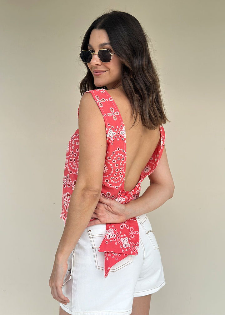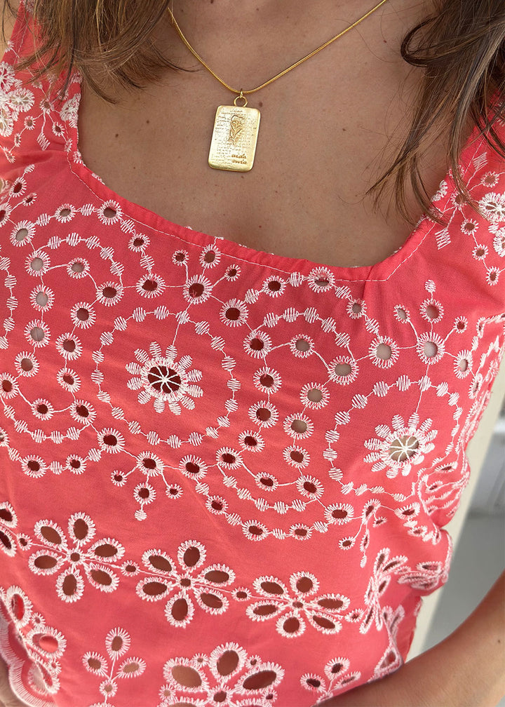Camisa en ojalillo color coral. Manga sisa, escote semi cuadrado en delantero y escote profundo en posterior con tiras libres para amarrar.