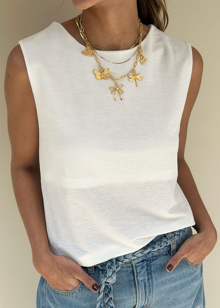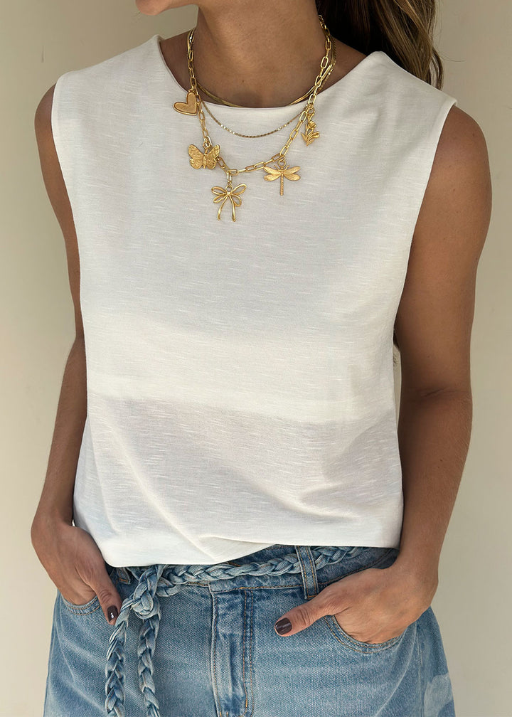 Camiseta en tejido de punto color marfil. Escote redondo, manga sisa y top interno. En espalda lleva entorchado en escote y abertura con elástico.