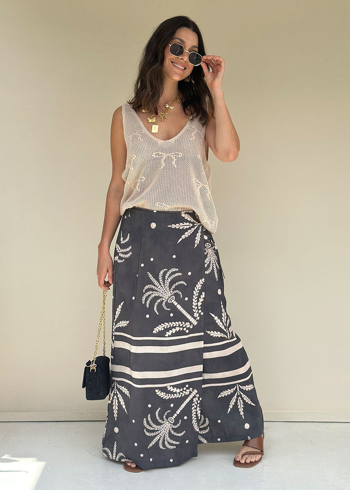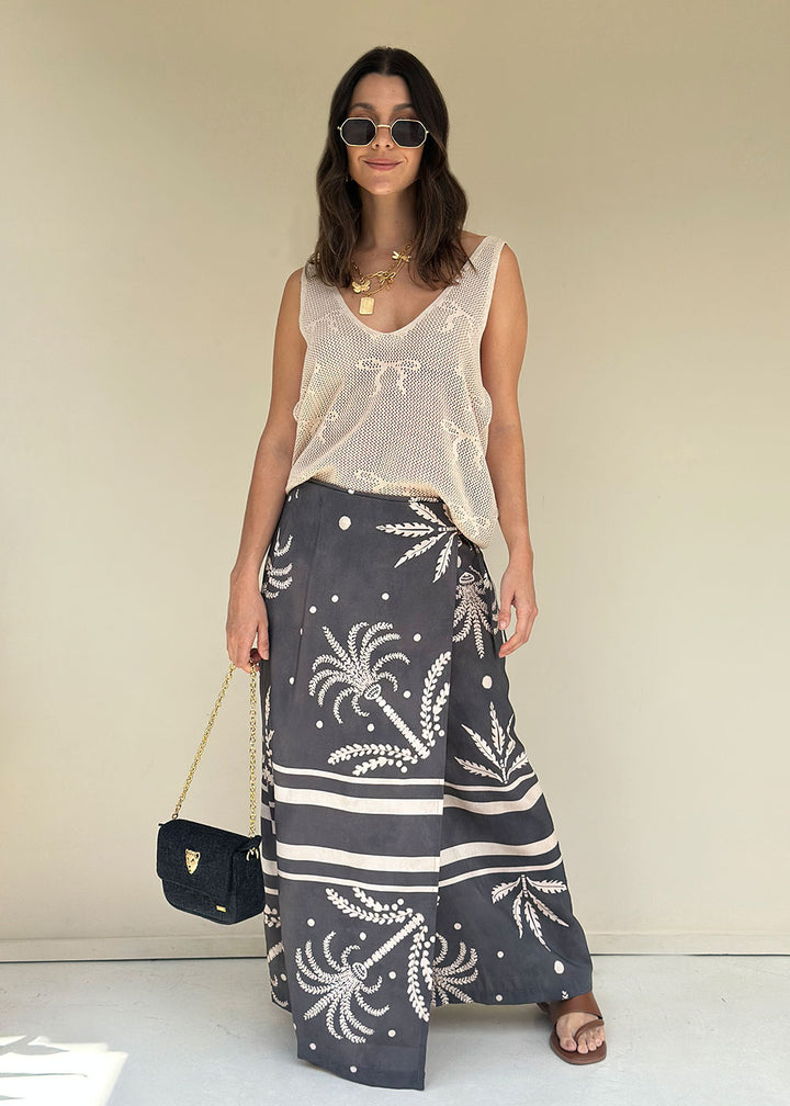Camisa en tejido con detalle de moños en color beige. Escote delantero y posterior en "V" y manga sisa.