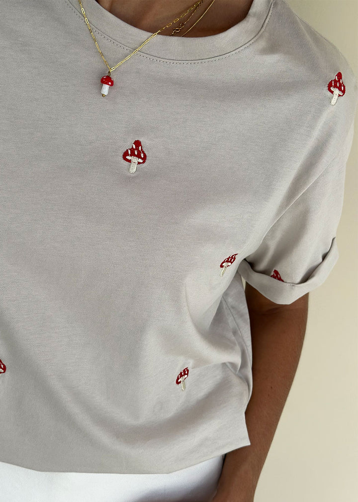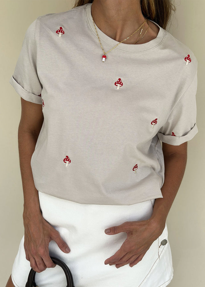 Camiseta en tejido de punto color beige con bordado de hongos. Cuello redondo y mangas con guardapolvo.