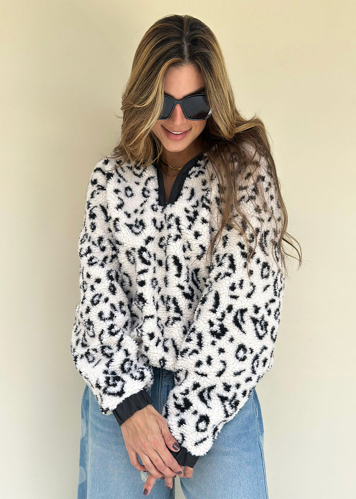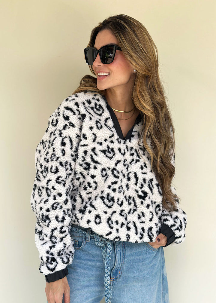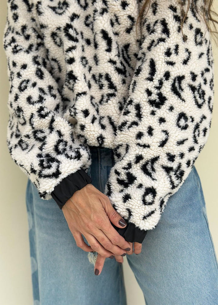 Chaqueta en sintético animal print Cuello alto con cremallera en perilla, puños y fajón con elástico interno y bolsillos funcionales en frente.