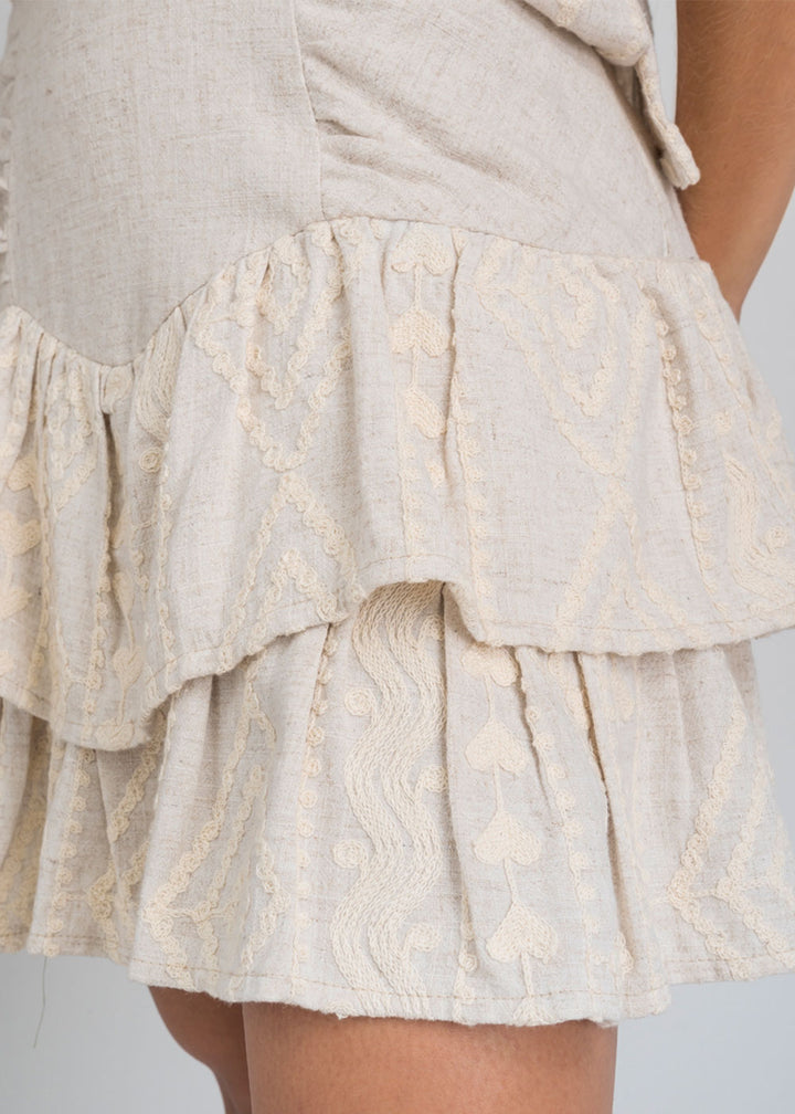 Falda corta en tono Marfil hecha en un tejido suave con bordados en relieve que le dan textura y un acabado especial. Tiene cintura ajustada y dos Boleros en la parte inferior que aportan movimiento y un look femenino.