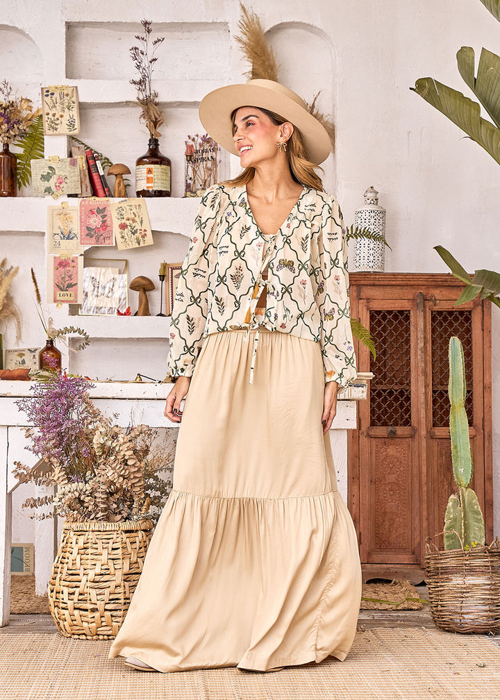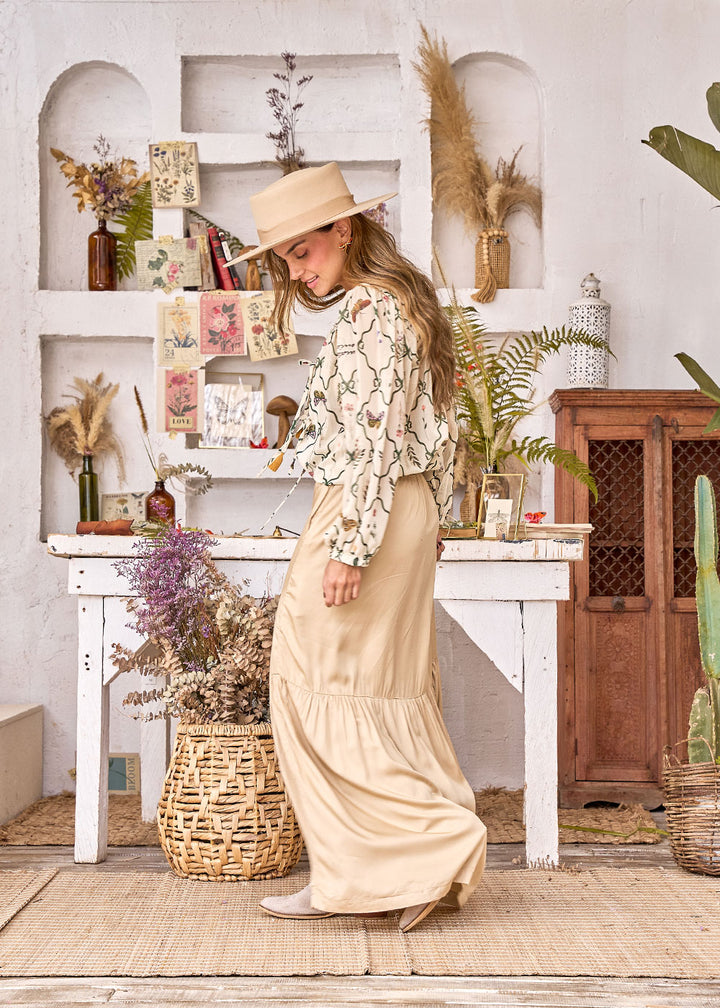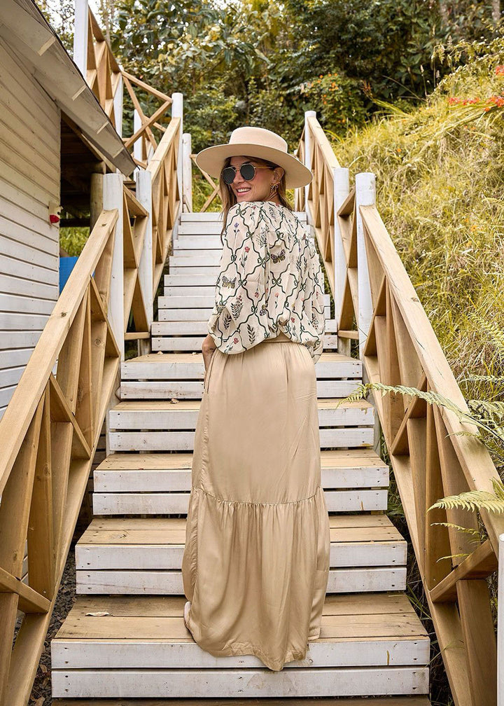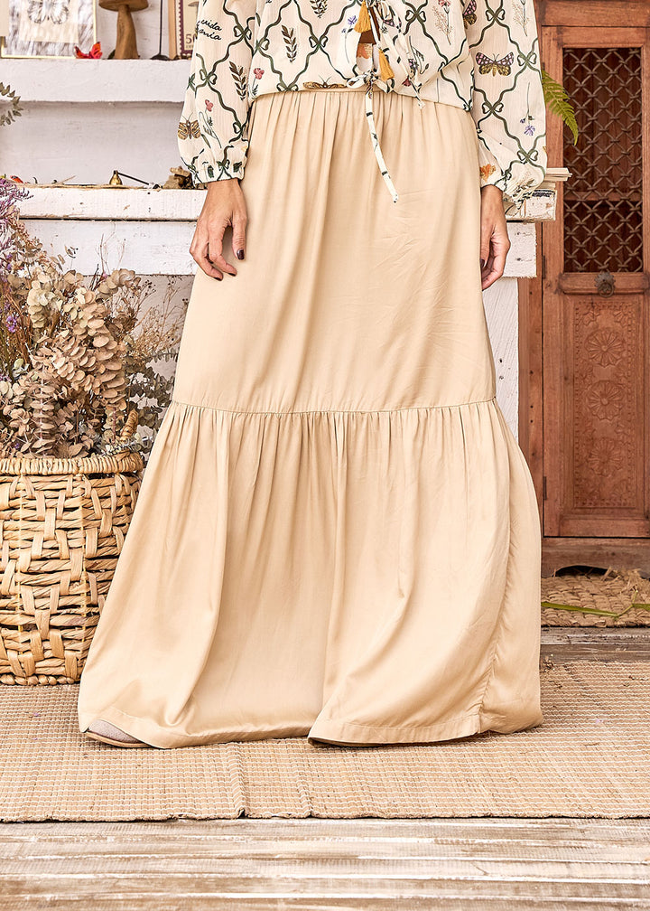 Falda larga en chalis color marfil. Pretina ancha con cremallera en lado izquierdo prenda puesta. Lleva corte en parte inferior con recogido. Silueta: Semi ajustada