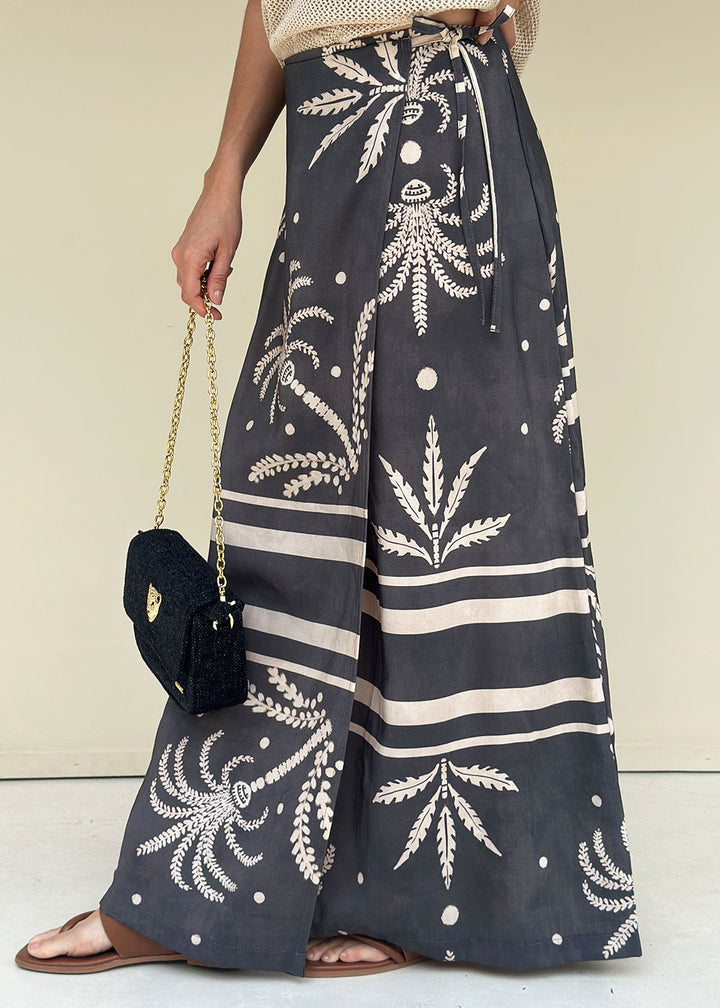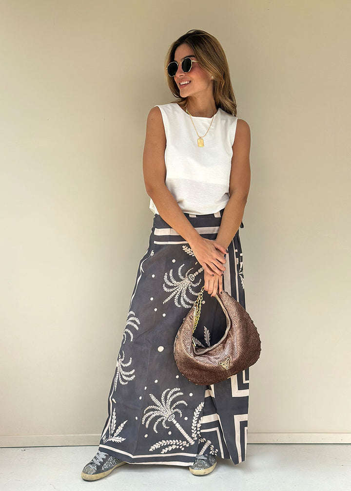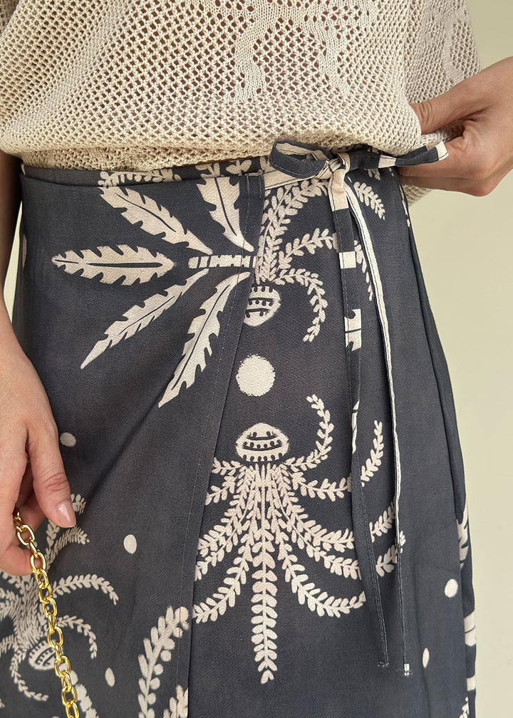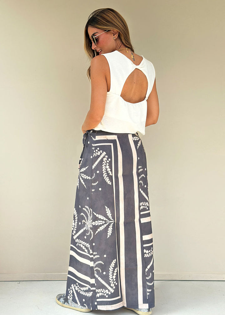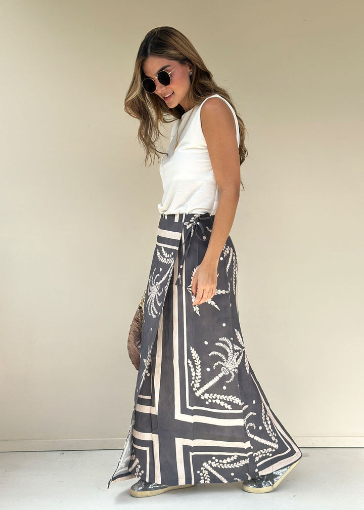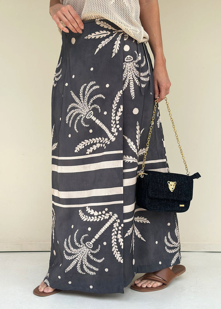 Falda larga en chalis con estampado fondeado. Falda con pieza sobrepuesta con botón interno y tiras libres para amarrar en lateral.