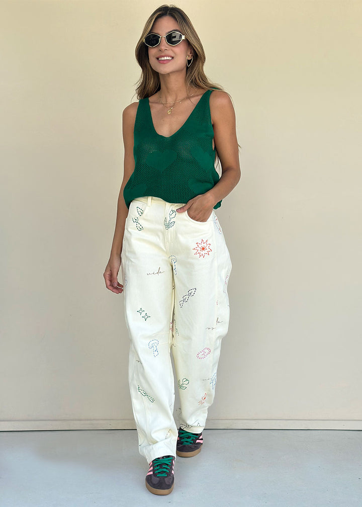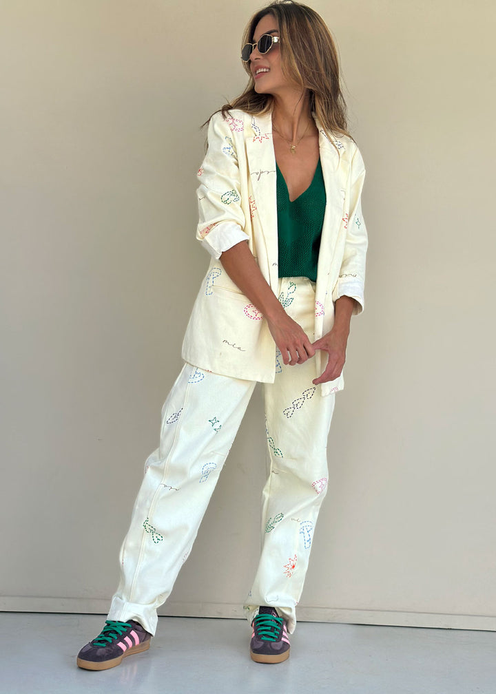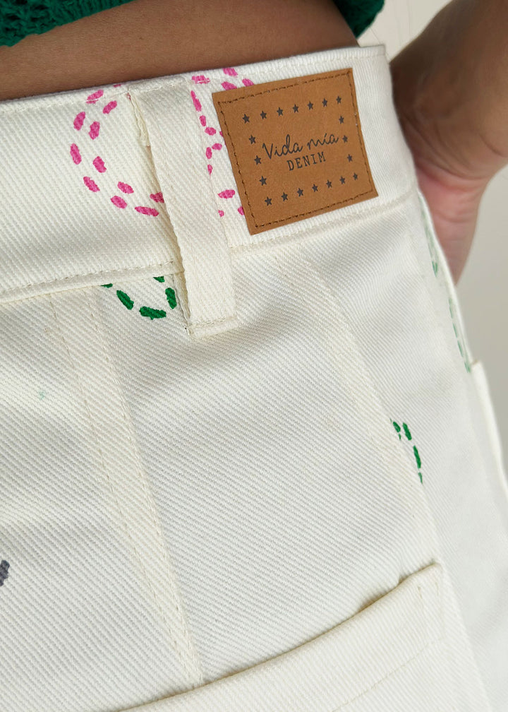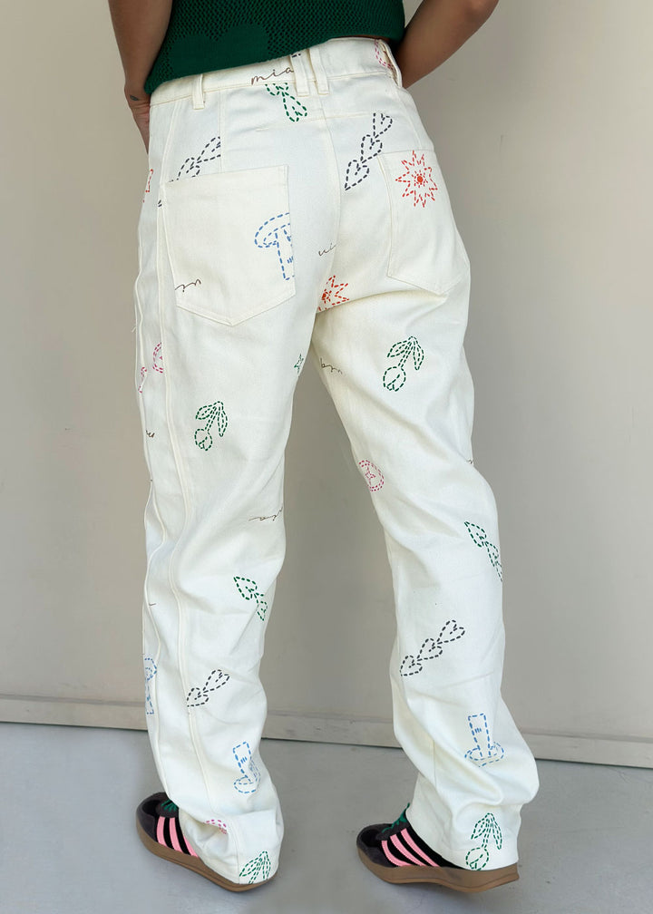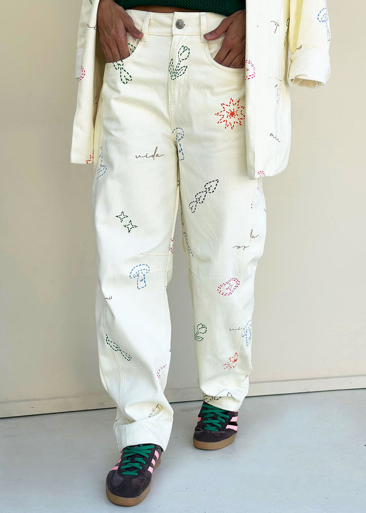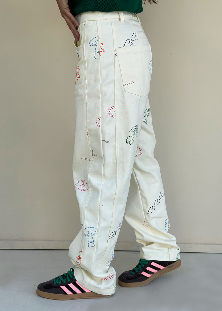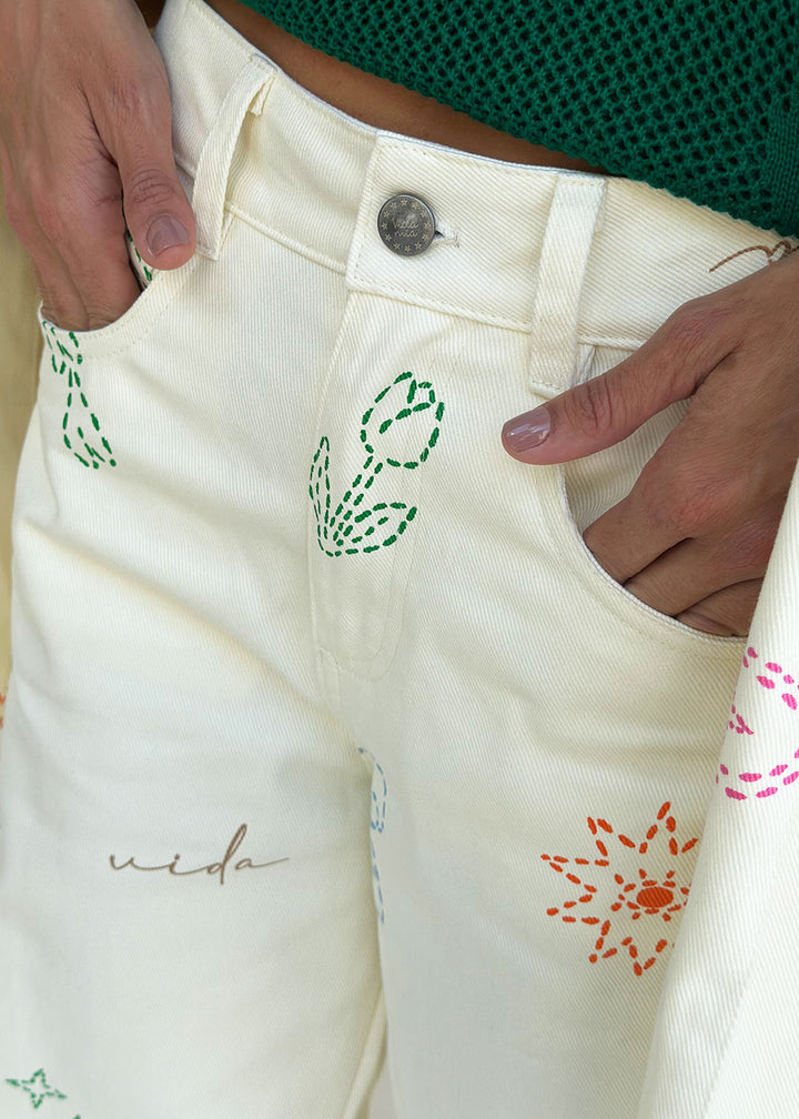 Pantalón en Drill color marfil con estampado fondeado. Pretina con pasadores, bolsillos funcionales en frente y posterior, cortes en laterales y pinzas a la altura de la rodilla. Silueta: Amplia