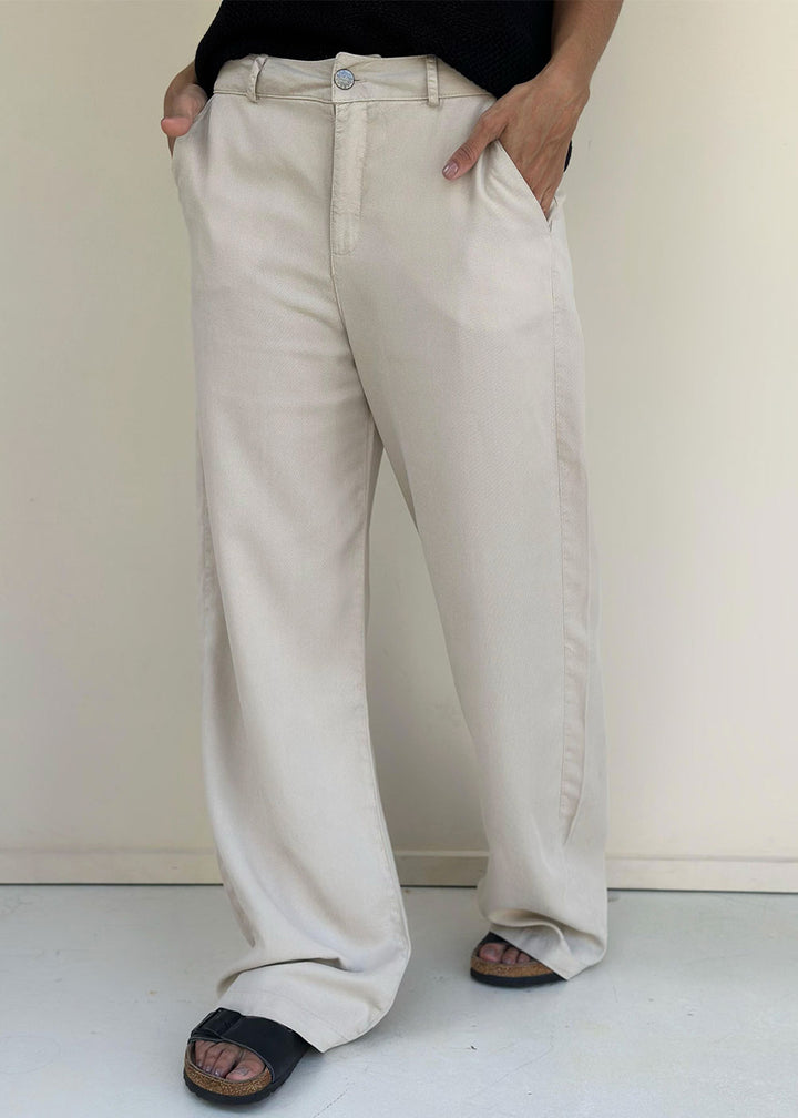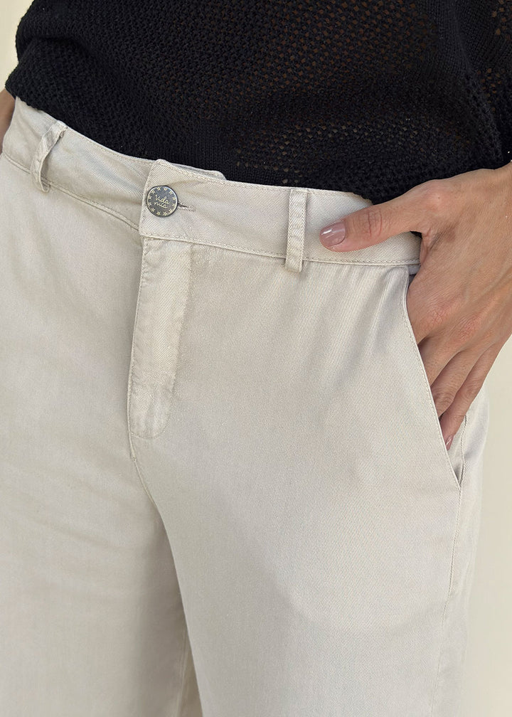 Pantalón en tejido plano color beige. Pretina con pasadores y bolsillos funcionales en laterales.